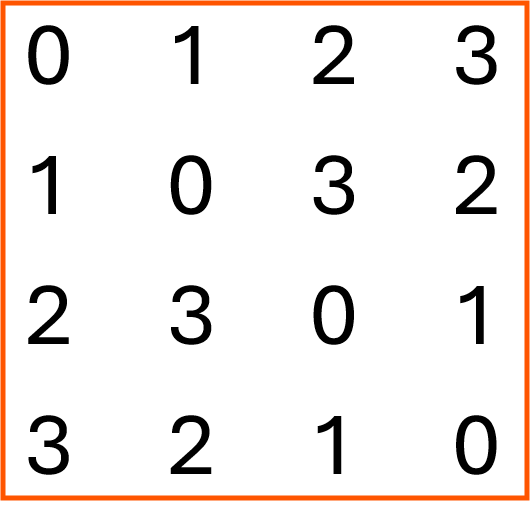 La somme des chiffres de chaque ligne et colonne vaut 4 et est formée par 4 chiffres différents entre 0 et 4.
